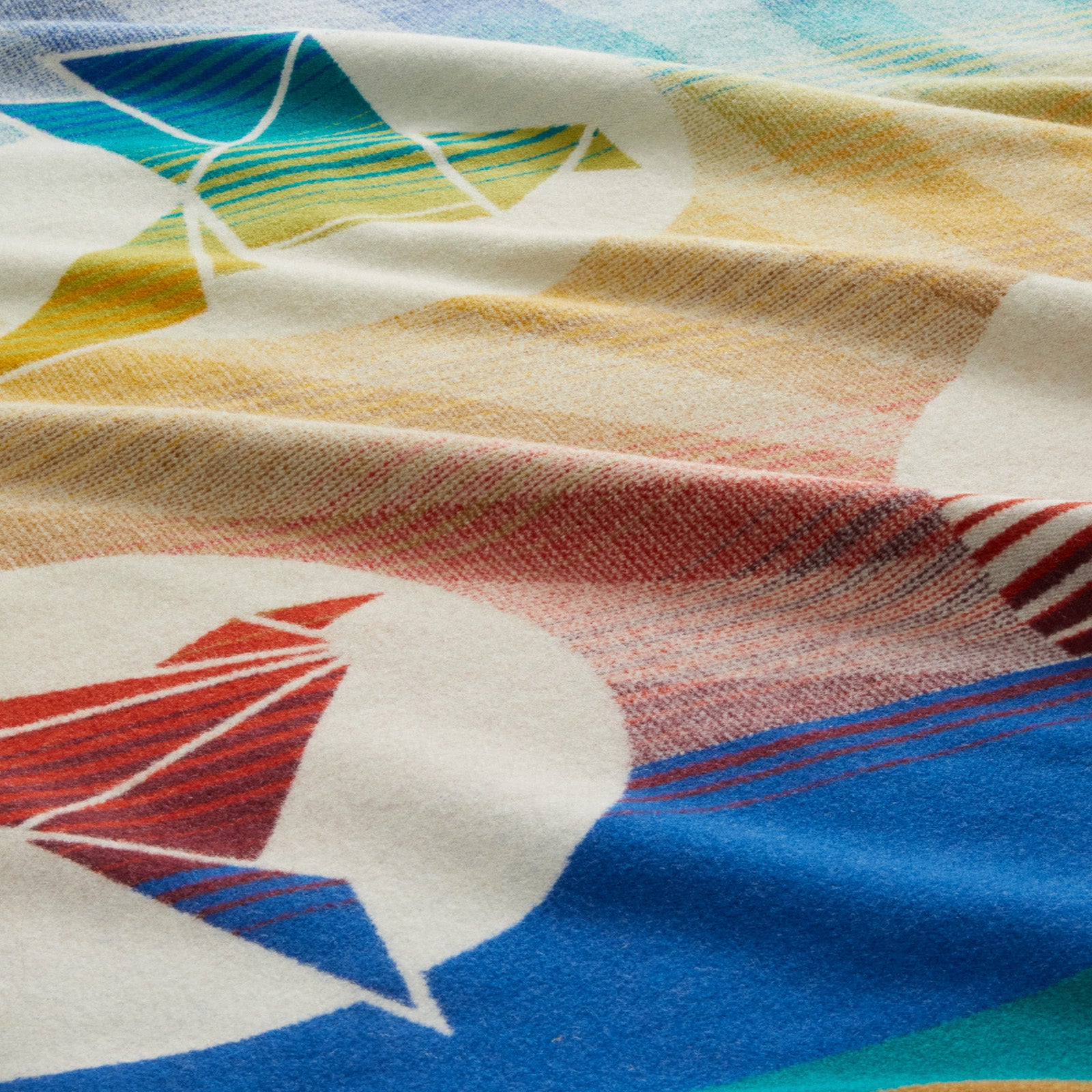 Vor dem Blau des Vaterhimmels erheben sich Singvögel von Mutter Erde, um die heilenden Strahlen der Morgensonne zu begrüßen. Die Vögel übermitteln Botschaften der Harmonie, Erneuerung und Ausgeglichenheit in einem Design, das das Bewusstsein für die Bewegung der vermissten und ermordeten indigenen Völker schärft. Ein türkisfarbenes Band symbolisiert das Leben, rote Bänder symbolisieren vermisste einheimische Verwandte, die niemals vergessen werden. Diese von der Diné-Künstlerin Lenadra Yazzie entworfene Decke wird in unserer Weberei in Pendleton, Oregon, aus reiner Schurwolle gewebt.