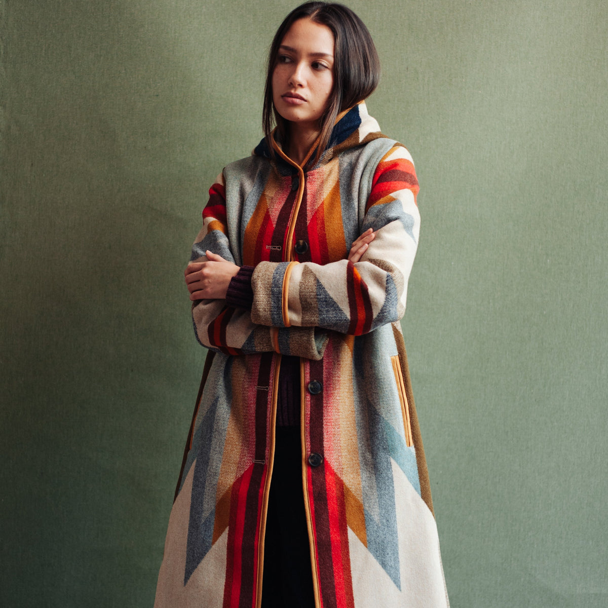With a dramatic length, a flowing silhouette, and the richness of USA-woven wool in our customer favorite Wyeth Trail pattern, this coat brings warmth and elegance to every season. Deep side vents and a generous layback hood elevate movement and coverage. Made from wool woven in Pendleton's Pacific Northwest mills, it's finished with button front styling and impeccable tailoring. Ultrasuede® trim binding and welt pockets. A timeless piece designed to showcase pattern and craftsmanship.