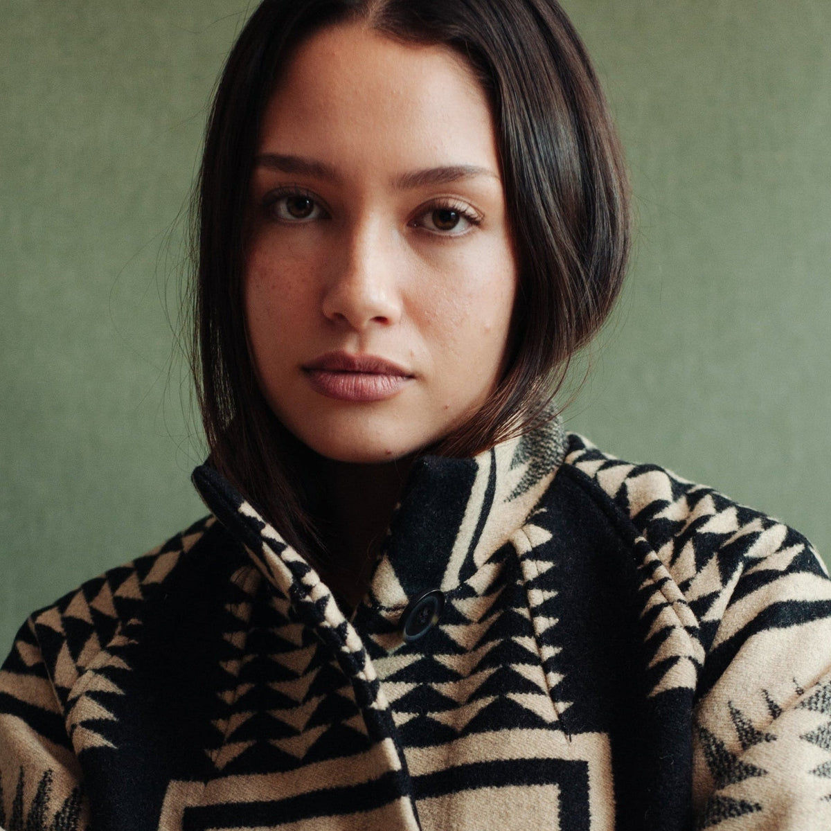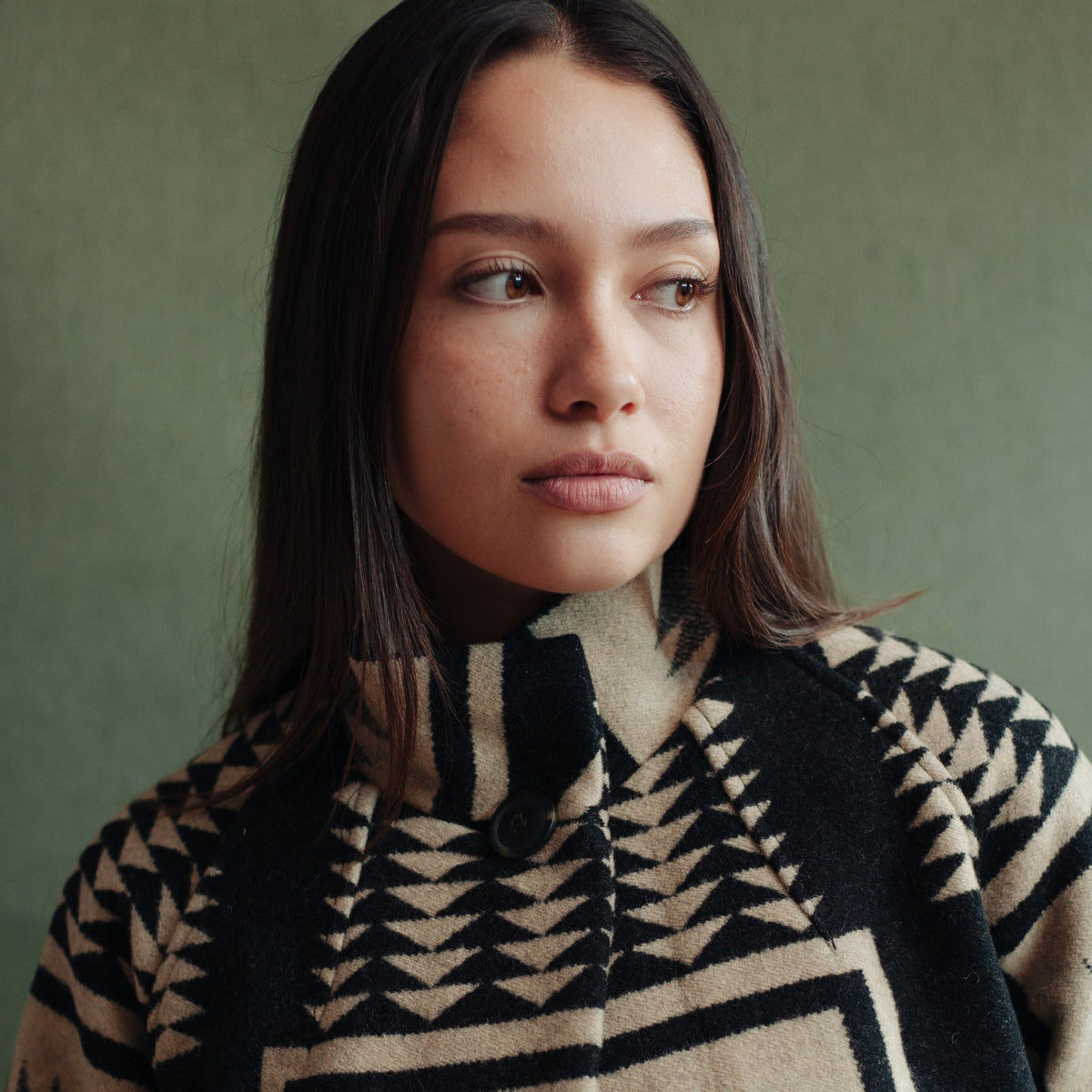 Crafted from wool woven in our USA mills, this striking coat features our archival 1920s Harding pattern, with an updated fit for easier layering. With an impeccably placed jacquard pattern, it has a button placket, button detail at wrists, taped interior seams, lined sleeves, and two front patch pockets.