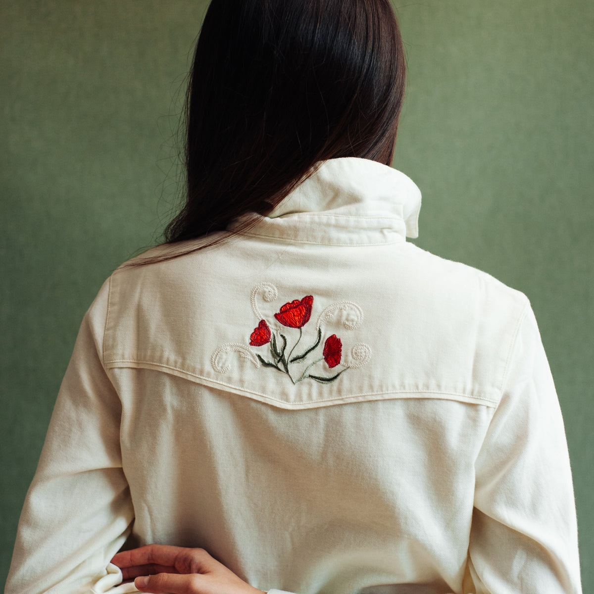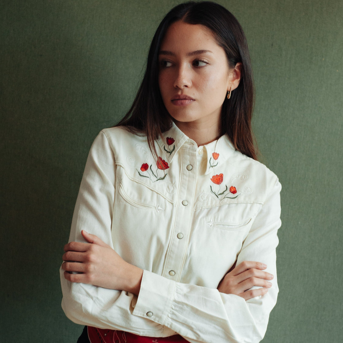 A feminine take on a classic Western shirt, with delicate and colorful poppy embroidery at the shoulders and back, angled snap-flap pockets and subtle yokes. Tailored for a flattering fit, this shirt is made from soft and breathable cotton twill for easy layering or wearing on its own.